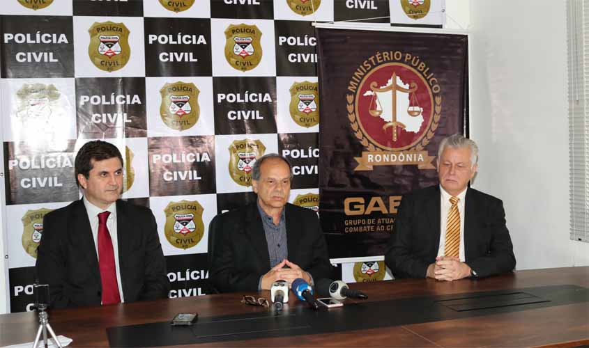 O diretor do Grupo de Atuação Especial de Combate ao Crime Organizado (GAECO), Procurador de Justiça Cláudio Wolff Harger; o delegado-geral da Polícia Civil do Estado de Rondônia, Samir Fouad Abboud e o Procurador do Ministério Público de Contas, Adilson Moreira de Medeiras, concederam entrevista coletiva para explicar os alvos da segunda fase da Operação Pau Oco, denominada Teste de Sabre.