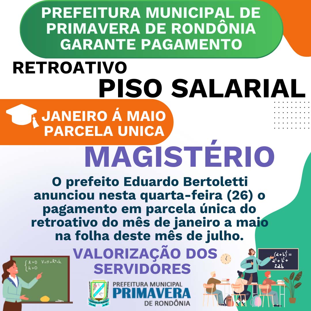 O prefeito Eduardo Bertoletti do município de Primavera de Rondônia anunciou nesta quarta-feira (26) o pagamento em cota única do valor do retroativo do piso salarial do magistério, o qual foi aprovado no mês de junho pela prefeitura municipal e a Câmara de Vereadores com planejamento de parcelar o retroativo.
