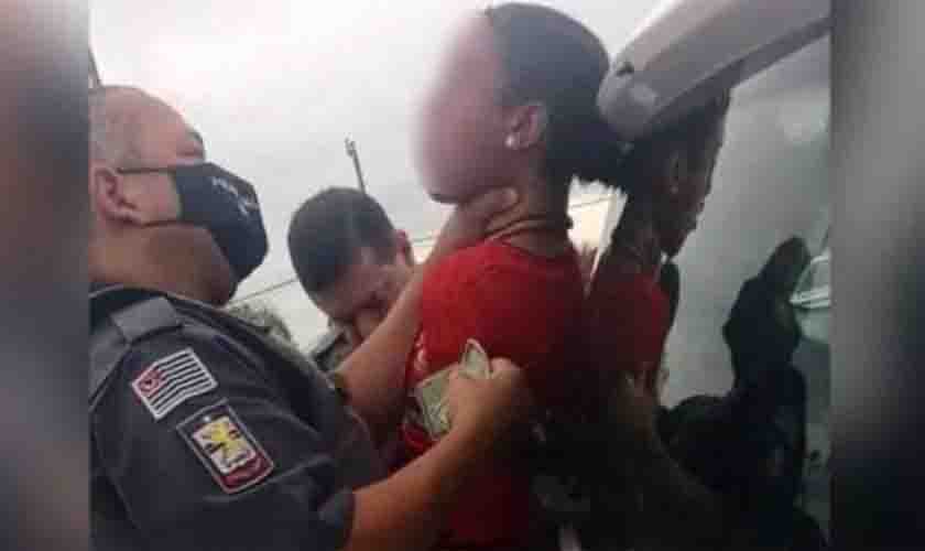 É possível ver que a mulher discute com os agentes e eles, com força, colocam os braços dela para trás e a algemam