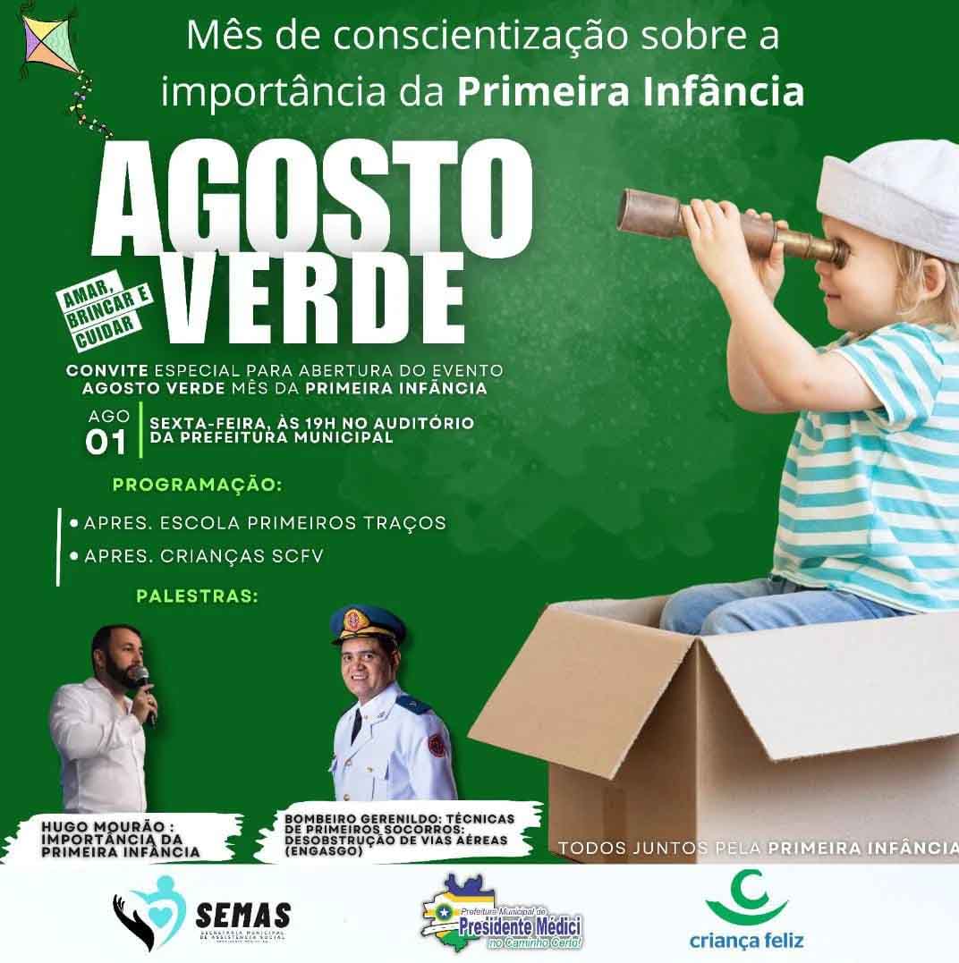 Em um importante movimento para fortalecer o cuidado e o desenvolvimento infantil, a Prefeitura de Presidente Médici convida toda a comunidade para uma ação especial de abertura do mês de conscientização sobre os cuidados com a primeira infância, o Agosto Verde. O evento acontece hoje, às 19h, no Auditório da Prefeitura Municipal e contará com palestras focadas em temas vitais para a segurança e bem-estar de bebês e crianças.