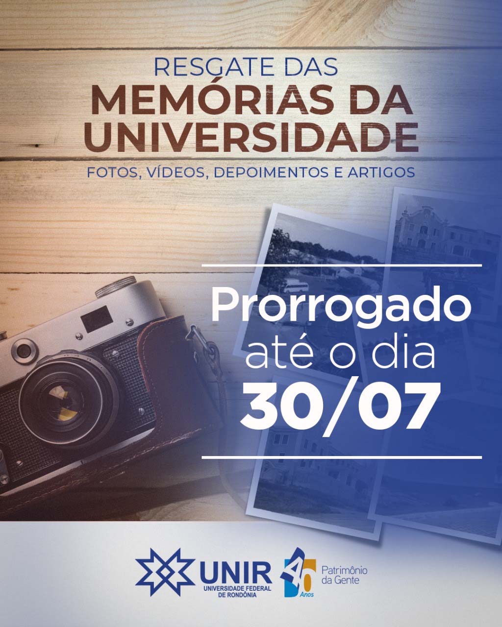 O prazo para envio de depoimentos e imagens (fotos e vídeos) para o projeto de resgate das memórias da Universidade Federal de Rondônia (UNIR) foi prorrogado até o dia 30 de julho. O projeto faz parte da celebração dos 40 anos de fundação da UNIR, comemorado em 8 de julho de 2022, e busca rememorar e resgatar a trajetória institucional da Universidade desde a sua criação até a atualidade.