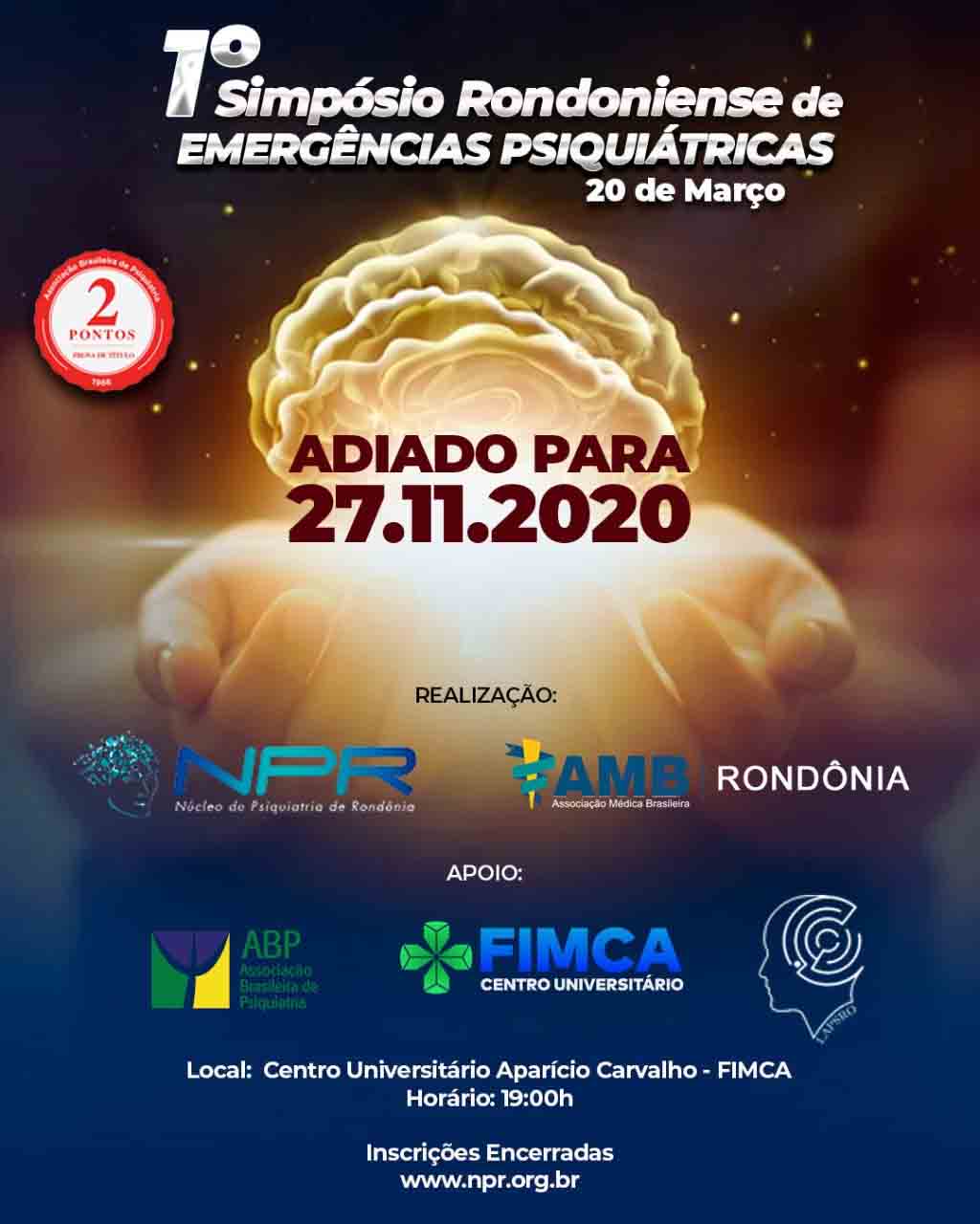 Obedecendo a determinação do Decreto Estadual de N° 24.871, de 16 de março de 2020, assinado pelo Governador do Estado de Rondônia, o qual define medidas temporárias preventivas de prevenção ao contágio e enfrentamento da propagação decorrente do novo Coronavírus (COVID-19), informamos que o 1º Simpósio Rondoniense de Emergências Psiquiátricas foi adiado para o dia 11 de novembro deste ano.