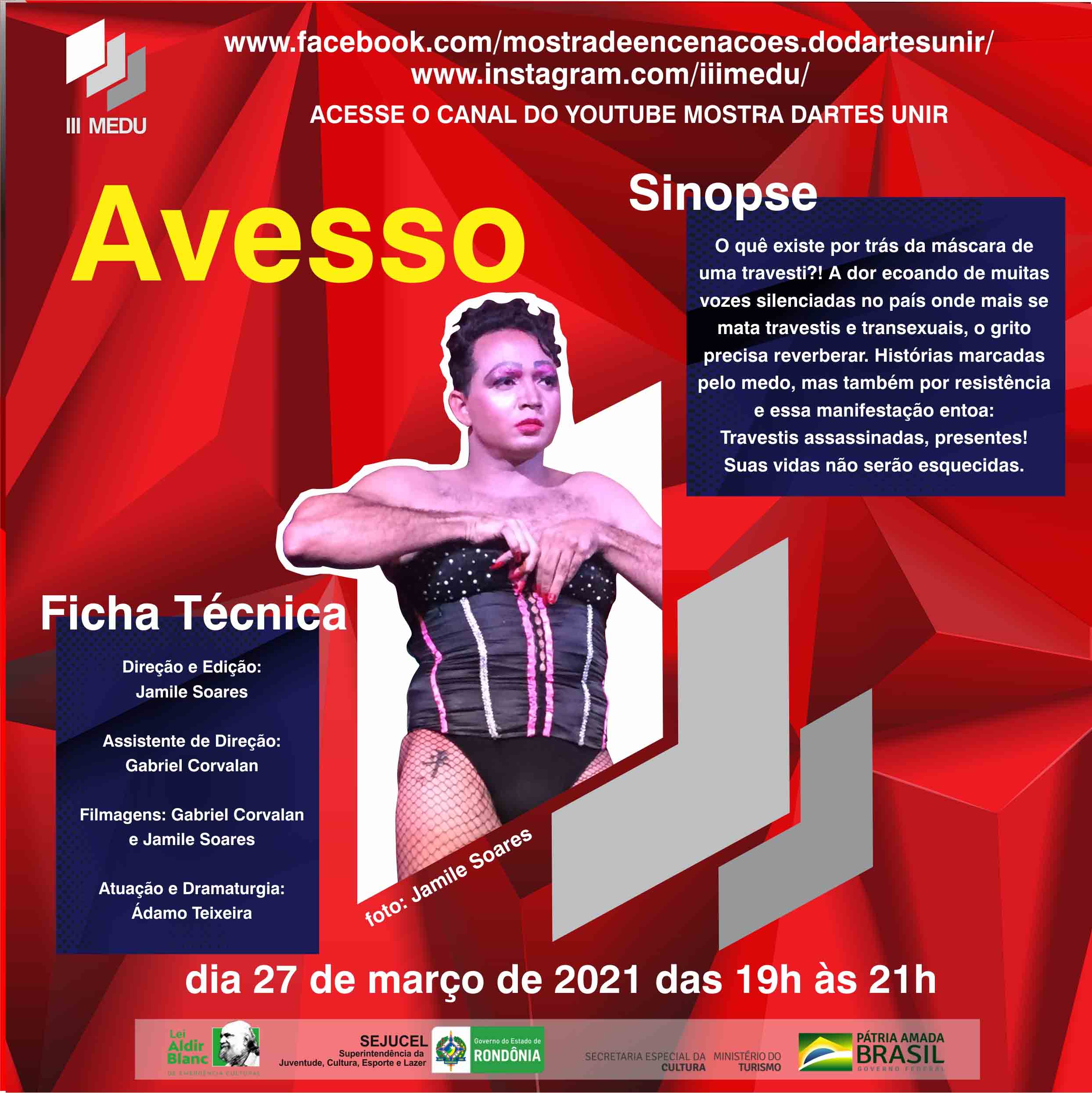 O segundo vídeo da Mostra é “Avesso”, que tem como encenadores os artistas Jamile Soares e Gabriel Corvalan. A atuação ficou por conta de Ádamo Teixeira e o responsável pela técnica foi o acadêmico Gabriel Corvalan. “Avesso” questiona o que existe por trás da máscara de uma travesti?! E segue respondendo que a dor ecoa de muitas vozes silenciadas no país onde mais se mata travestis e transexuais, o grito precisa reverberar. Histórias marcadas pelo medo, mas também por resistência e essa manifestação entoa: Travestis assassinadas, presentes! Suas vidas não serão esquecidas.