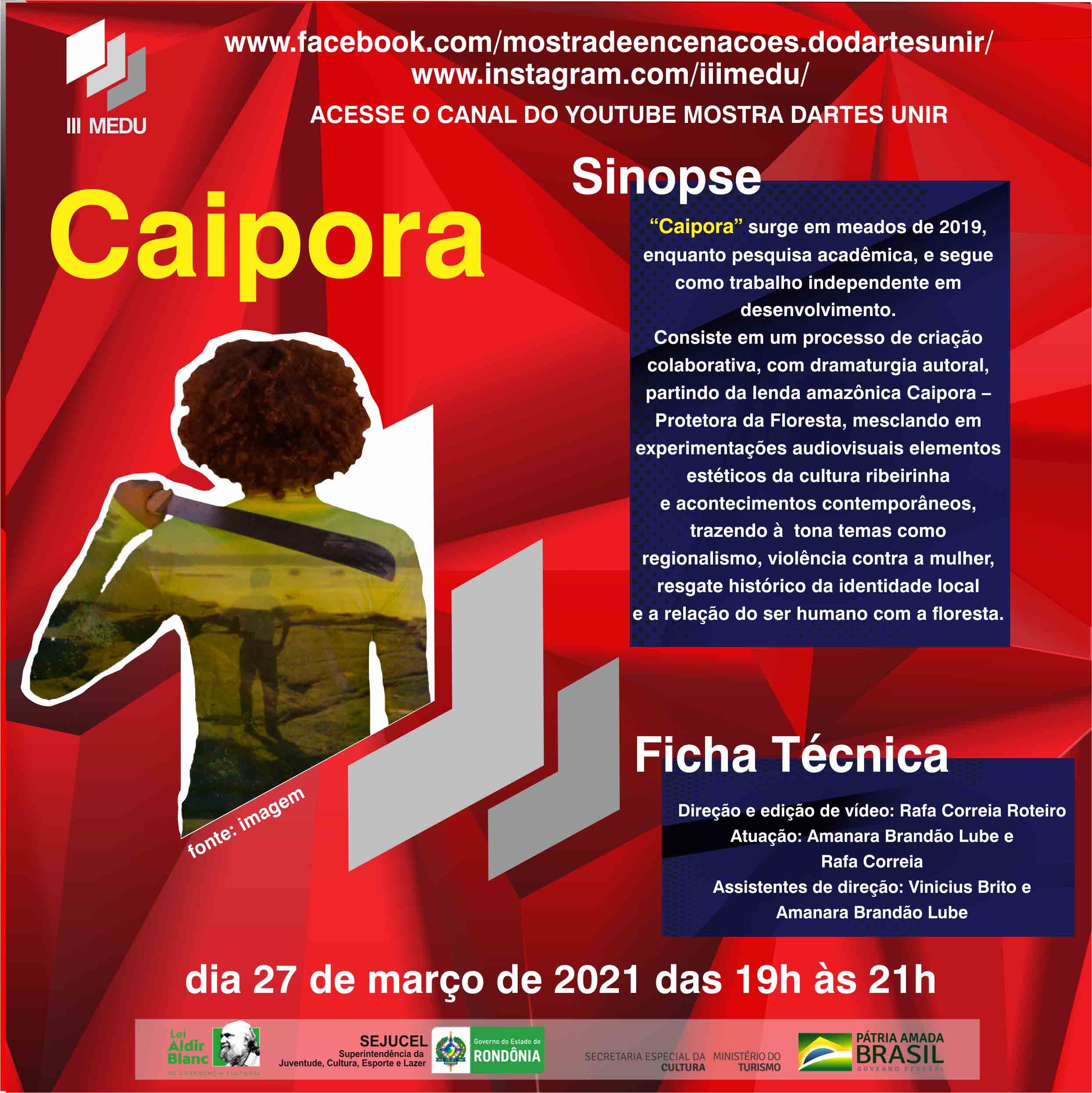 A programação deste sábado (28) começa com a exibição do vídeo “Caipora”, que contou com a encenação de Amanara Brandão, Rafa Correia e Vinicius Brito e atuação de Rafa Correia. “Caipora” surge em meados de 2019, enquanto pesquisa acadêmica, e segue como trabalho independente em desenvolvimento. Consiste em um processo de criação colaborativa, com dramaturgia autoral, partindo da lenda amazônica Caipora – Protetora da Floresta, mesclando em experimentações audiovisuais elementos estéticos da cultura ribeirinha e acontecimentos contemporâneos, trazendo à tona temas como regionalismo, violência contra a mulher, resgate histórico da identidade local e a relação do ser humano com a floresta.
