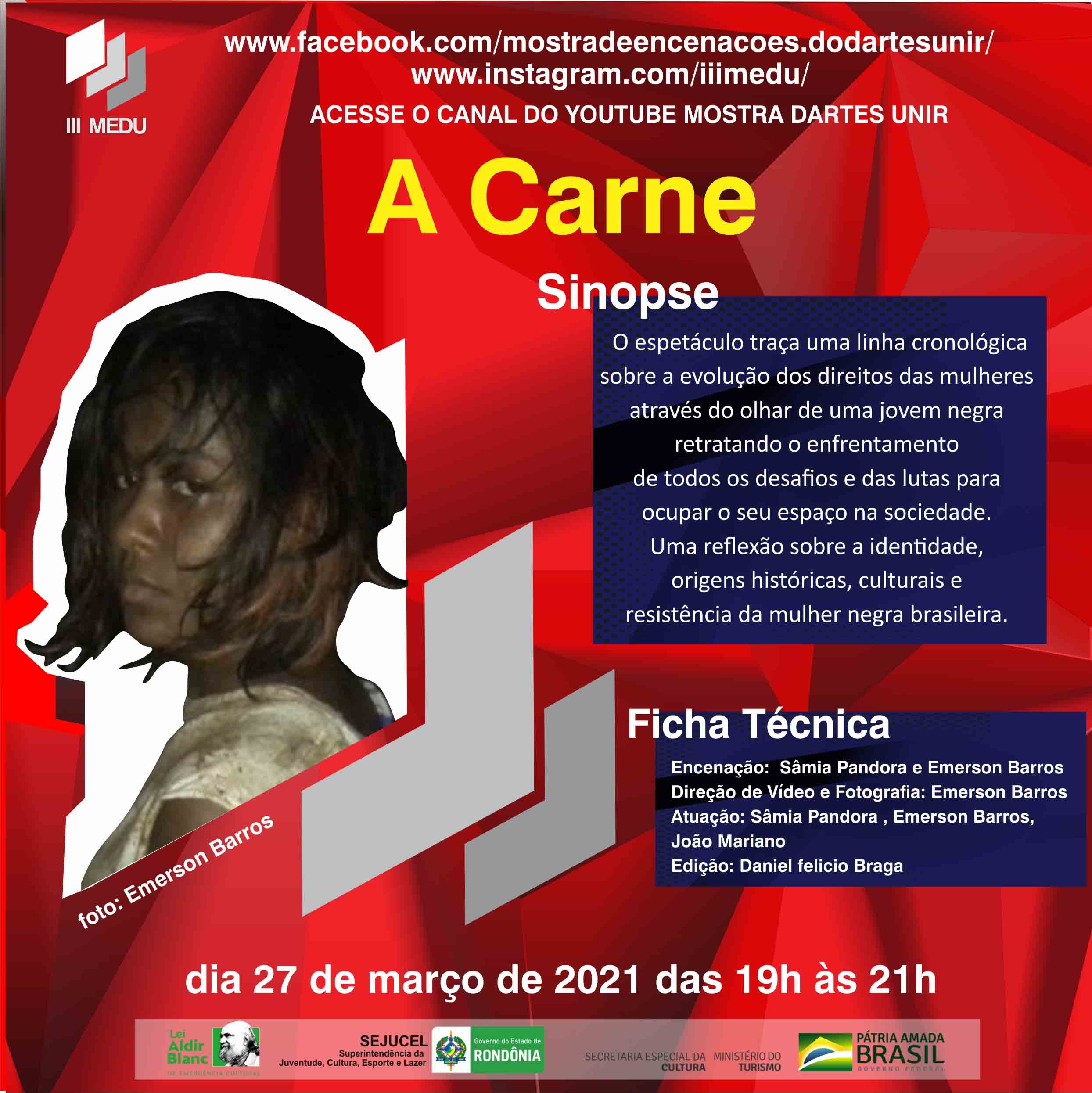 No dia 27 de março é comemorado o Dia Mundial do Teatro e para celebrar essa data tão especial, a 3ª Mostra de Encenações do DArtes/UNIR (IIIMEDU) apresenta uma programação com quatro obras audiovisuais produzidas pelos acadêmicos do Curso de Licenciatura em Teatro da Universidade Federal de Rondônia (UNIR). Neste sábado é dia de ver “Caipora”, “Avesso”, “A Carne” e “Eldorado”, a partir das 19h (horário de Rondônia), no link: https://youtu.be/mAZECPVcUxA.