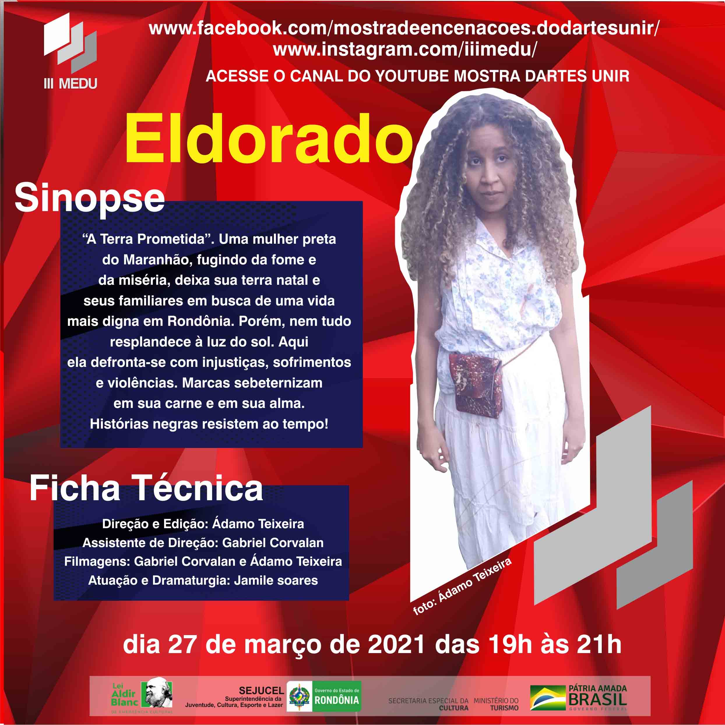 Finalizando, o evento exibirá o vídeo “Eldorado”, que tem como encenadores Ádamo Teixeira e Gabriel Corvalan, atuação da atriz Jamile Soares e técnica de Gabriel Corvalan. “A Terra Prometida”. Uma mulher preta do Maranhão, fugindo da fome e da miséria, deixa sua terra natal e seus familiares em busca de uma vida mais digna em Rondônia. Porém, nem tudo resplandece à luz do sol. Aqui ela se defronta com injustiças, sofrimentos e violências. Marcas se eternizam em sua carne e em sua alma. Histórias negras resistem ao tempo!