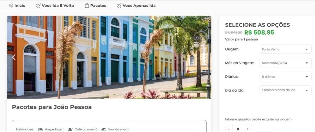 São 5 dias de viagem para João Pessoa a partir de R$ 509. Acesse aqui essa promoção. O pacote inclui voos de ida e volta saindo de Porto Velho para a capital da Paraíba e hospedagem em hotel com café da manhã. Mas seja rápido! São poucos pacotes de viagens baratos para a capital paraibana.