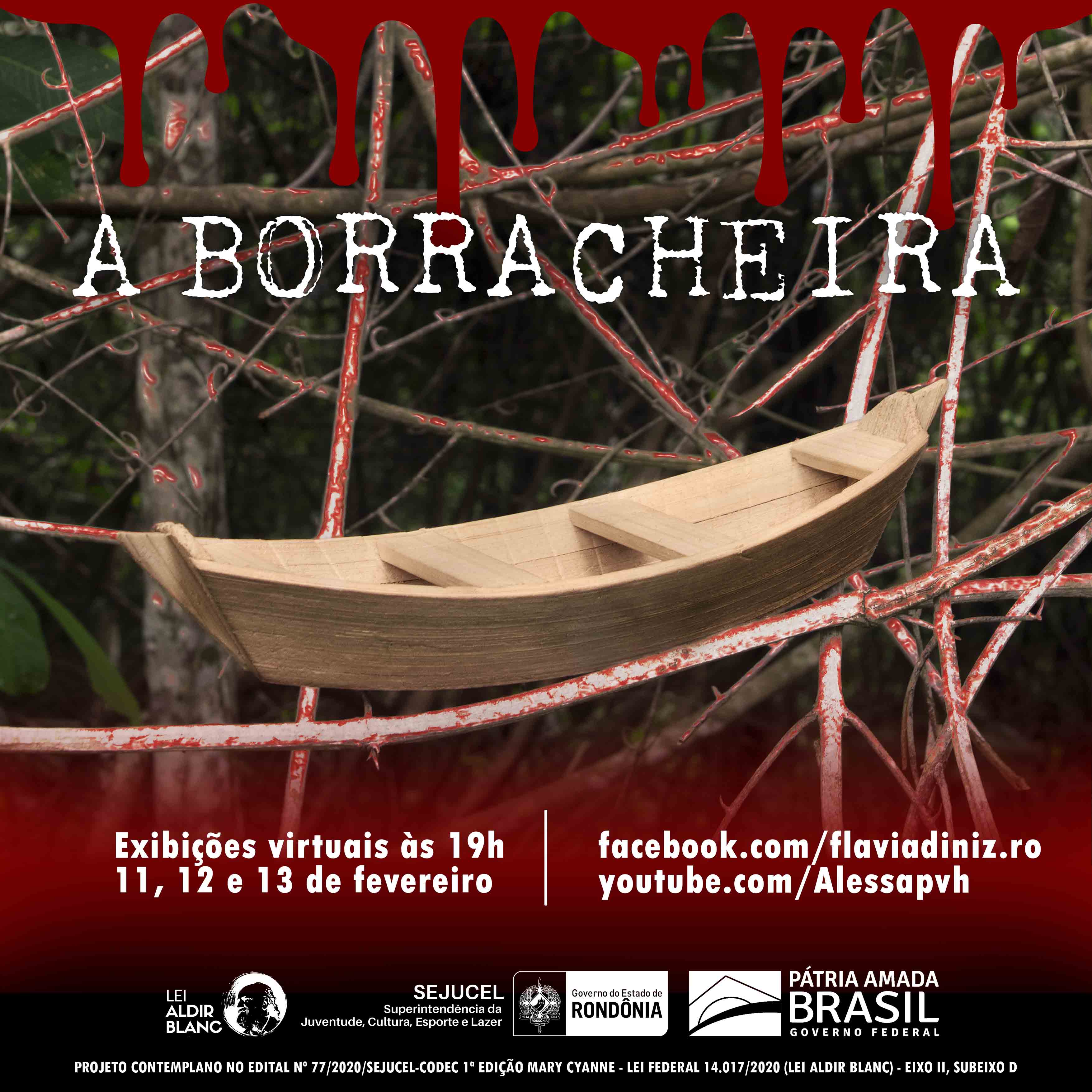O espetáculo “A Borracheira” será exibido/transmitido pelas redes sociais, nos dias 11, 12 e 13 de fevereiro. “A Borracheira” que é resultado de estudo e pesquisa cênica sobre narrativas de mulheres que viveram e vivem em ambiente extremamente hostil e dominados pelo "pensamento-homem" nos seringais do Vale do Guaporé, região do Estado de Rondônia limítrofe com a República Bolívia.