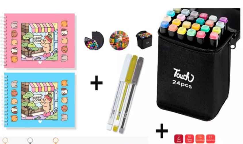 (Kit Colorir Bob Goods + 24 Canetas + 3 Canetas Gel + Labubu) (Livro de Colorir Labubu Capa Dura) Entre os destaques, estão: para os criativos de plantão, o Kit Colorir Bob Goods + 24 Canetas + 3 Canetas Gel + Labubu (R$ 190,00) oferece uma experiência divertida e personalizada. Outra opção é o Livro de Colorir Labubu Capa Dura, com 50 folhas no formato A5, por R$ 37,90, perfeito para momentos de relaxamento e expressão artística.