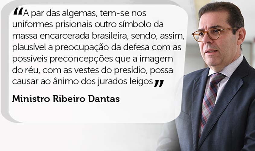 "A par das algemas, tem-se nos uniformes prisionais outro símbolo da massa encarcerada brasileira, sendo, assim, plausível a preocupação da defesa com as possíveis preconcepções que a imagem do réu, com as vestes do presídio, possa causar ao ânimo dos jurados leigos", afirmou o relator do recurso em mandado de segurança, ministro Ribeiro Dantas.