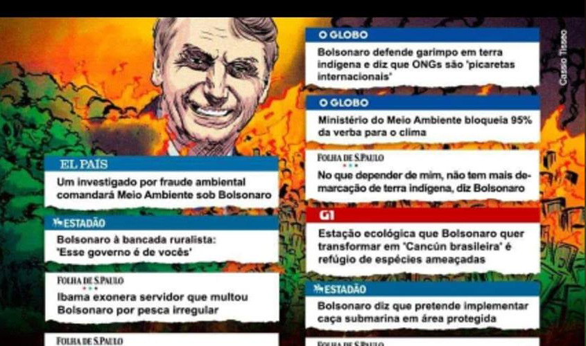 Bolsonaro é responsável sim pelo aumento vertiginoso este ano das queimadas na Amazônia. Todas as decisões tomadas pelo seu governo na área do meio ambiente já denunciavam que o “Capitão Motosserra” partiria sem dó nem piedade para cima da maior floresta tropical do mundo. O fogo se alastrou e assombrou o mundo, que o acuou e lhe impôs limite. Nunca antes na História um presidente da república sujou tanto a imagem do Brasil no exterior como esse maluco. Estive recentemente na Europa e percebi que por lá o ódio ao Bolsonaro é comum em todos os países. Suas declarações estapafúrdias e o flagrante despeito à natureza irritaram sobremaneira tanto o cidadão comum quanto os líderes do velho continente. Diante das pressões, o “Mito” ou afina o tom de suas bravatas ou enfia a viola no saco para “bostejar” em outro lugar bem longe.