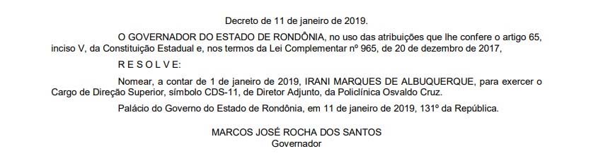 Tudo em família no governo do PSL em Rondônia. O coronel governador Marcos Rocha nomeou sua ex-mulher para o cargo de diretora-adjunta da Policlínica Oswaldo Cruz, ganhando CDS 11, depois de nomear a atual esposa, Luana Nunes de Oliveira Santos (que não leva Rocha), para comandar a Secretaria de Assistência e do Desenvolvimento Social (Seas).