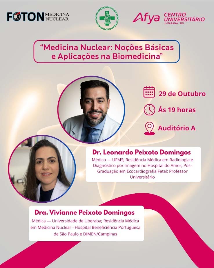 Aberto ao público, o encontro tem como objetivo aprofundar o conhecimento sobre uma das áreas mais inovadoras da medicina diagnóstica, que utiliza pequenas quantidades de material radioativo para investigar o funcionamento de órgãos e tecidos. A atividade contará com a presença de dois profissionais com ampla experiência na área: o Dr. Leonardo Peixoto Domingos, médico com residência em Radiologia e Diagnóstico por Imagem pelo Hospital de Amor, e a Dra. Vivianne Peixoto Domingos, médica com residência em Medicina Nuclear pela Beneficência Portuguesa de São Paulo e DIMEN/Campinas.