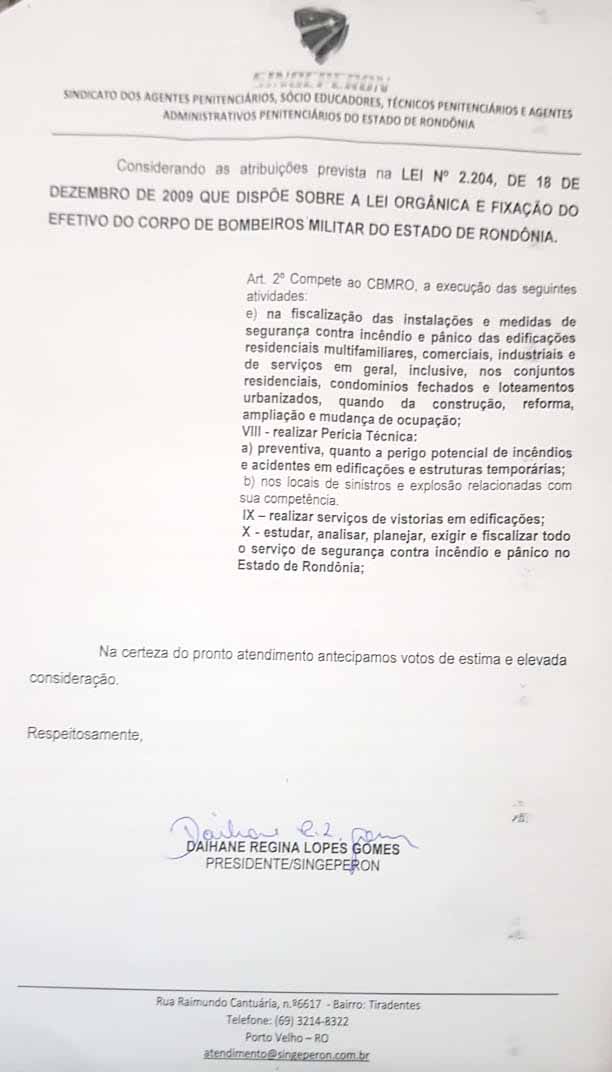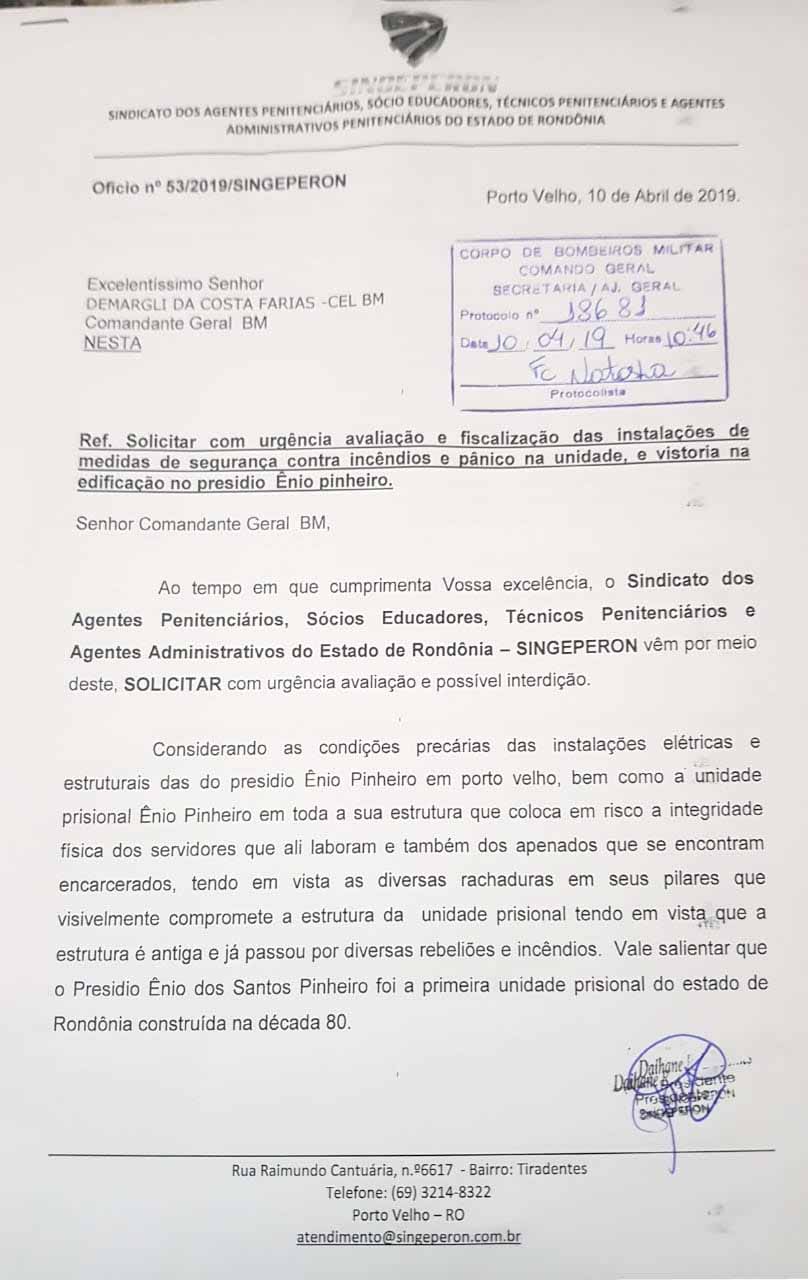 Nesta quarta-feira (10), o Singeperon- Sindicato dos Agentes Penitenciários e Sócio Educadores - protocolou ofício, junto ao comandante geral do Corpo de Bombeiros, solicitando, com urgência, avaliação, fiscalização e uma possível interdição do presídio Ênio Pinheiro, de Porto Velho.
