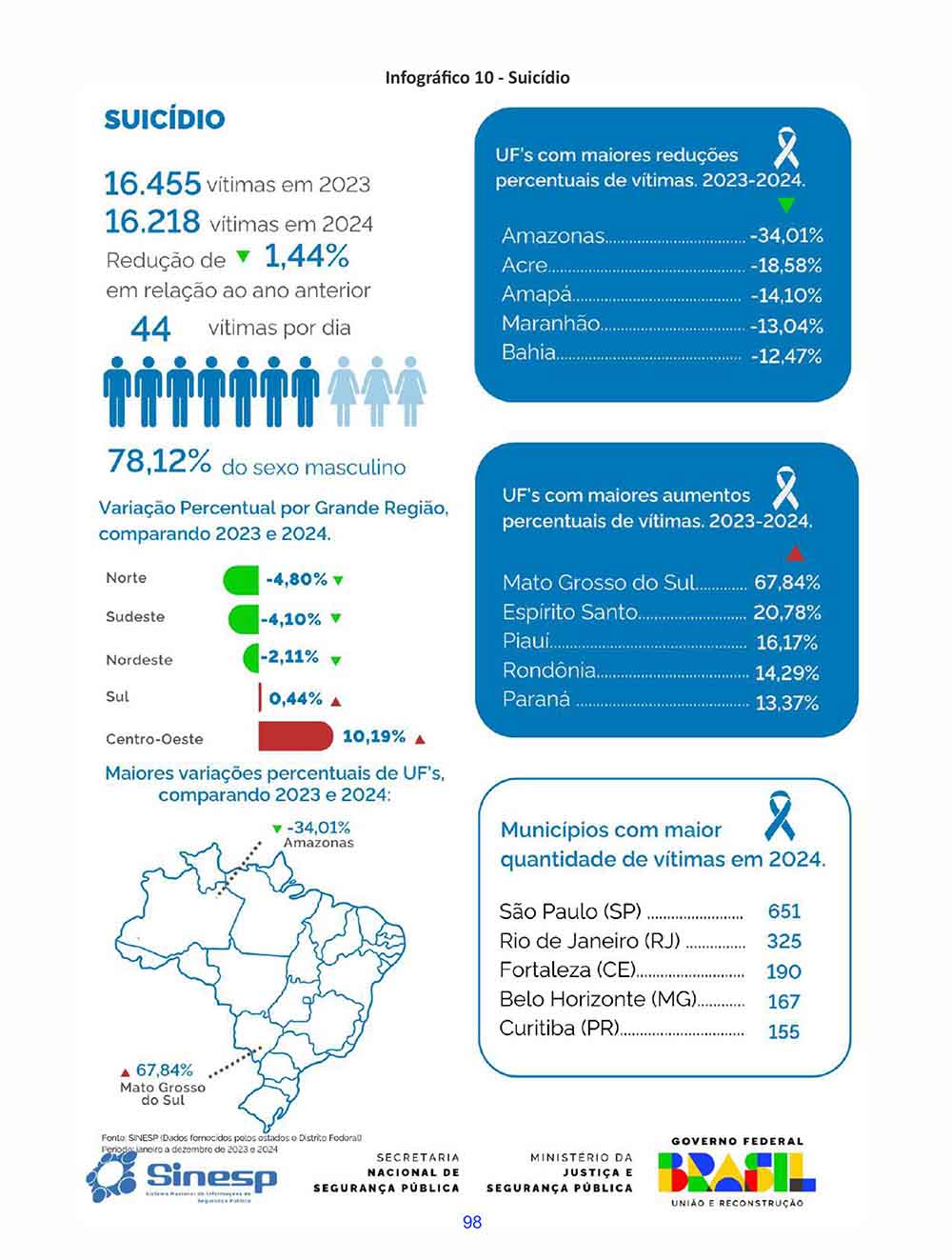No mesmo período, o Brasil registrou queda de 1,44%. O número de suicídios passou de 16.455 casos em 2023 para 16.218 em 2024, o que equivale a aproximadamente 44 mortes por dia em todo o território nacional. A taxa nacional caiu de 7,77 para 7,63 por 100 mil habitantes, após quatro anos de crescimento consecutivo.