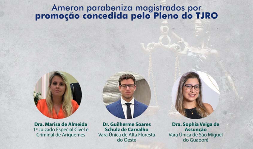 A Associação dos Magistrados do Estado de Rondônia (Ameron) parabeniza a promoção concedida pelo Tribunal de Justiça do Estado de Rondônia, para os magistrados: Marisa de Almeida, Guilherme Soares Schulz de Carvalho e Sophia Veiga de Assunção.