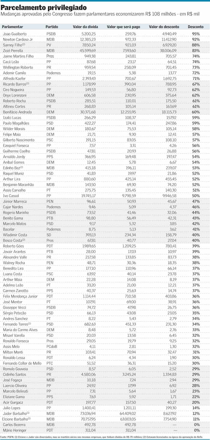 O conceituado Valor Econômico publicou na última segunda-feira (16) matéria intitulada “Refis reduz dívidas dos parlamentares”. O site informa, inicialmente, que “As mudanças feitas por deputados e senadores no programa de refinanciamento de dívidas (Refis) com a União, a contragosto da equipe econômica do governo, renderam descontos generosos aos próprios parlamentares que aprovaram as medidas provisórias”. E vai além: em alguns casos, ao utilizarem as regras criadas por eles próprios, os congressistas chegaram a pagar apenas 5% do valor que o governo cobrava.