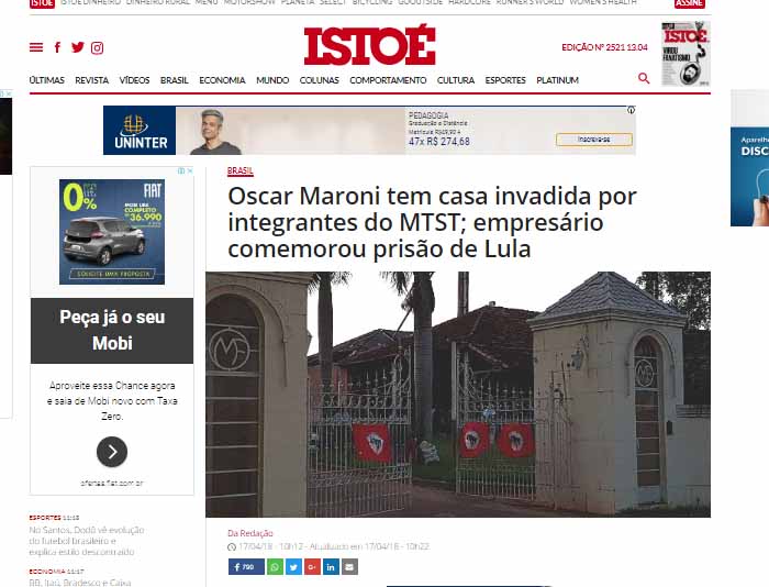 Saiu na versão online da Isto É! A fazenda do empresário Oscar Maroni foi invadida por integrantes do MTST na manhã desta terça-feira (17). O local fica em Araçatuba, a cerca de 550 quilômetros da capital paulista. O grupo alegou que a invasão foi motivada pela “arbitrariedade da prisão” do ex-presidente Luiz Inácio Lula da Silva (PT) e também pela reforma agrária. Antes de o petista ir preso, Maroni ofereceu cervejas grátis em seu estabelecimento para comemorar a prisão. Ele é conhecido por ser o magnata do sexo e dono da casa de shows Bahamas.