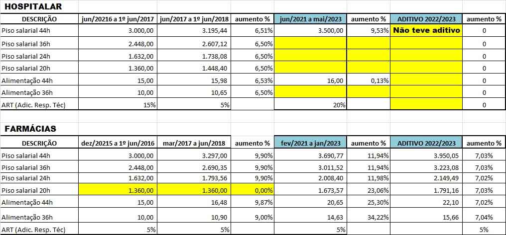 O escritório do advogado trabalhista e sindical Itamar Ferreira elaborou duas planilhas em que compara a evolução dos valores com respectivos reajustes a partir de junho de 2016 até 2023, este foi o ano em que expirou as vigências das CCTs dos dois segmentos sem que novas negociações para assinaturas de acordos fossem concluídas; com exceção das Farmácias que fecharam acordo em fevereiro de 2025, aumentando ainda mais a diferença em relação ao segmento hospitalar que continua sem CCT desde junho de 2023.