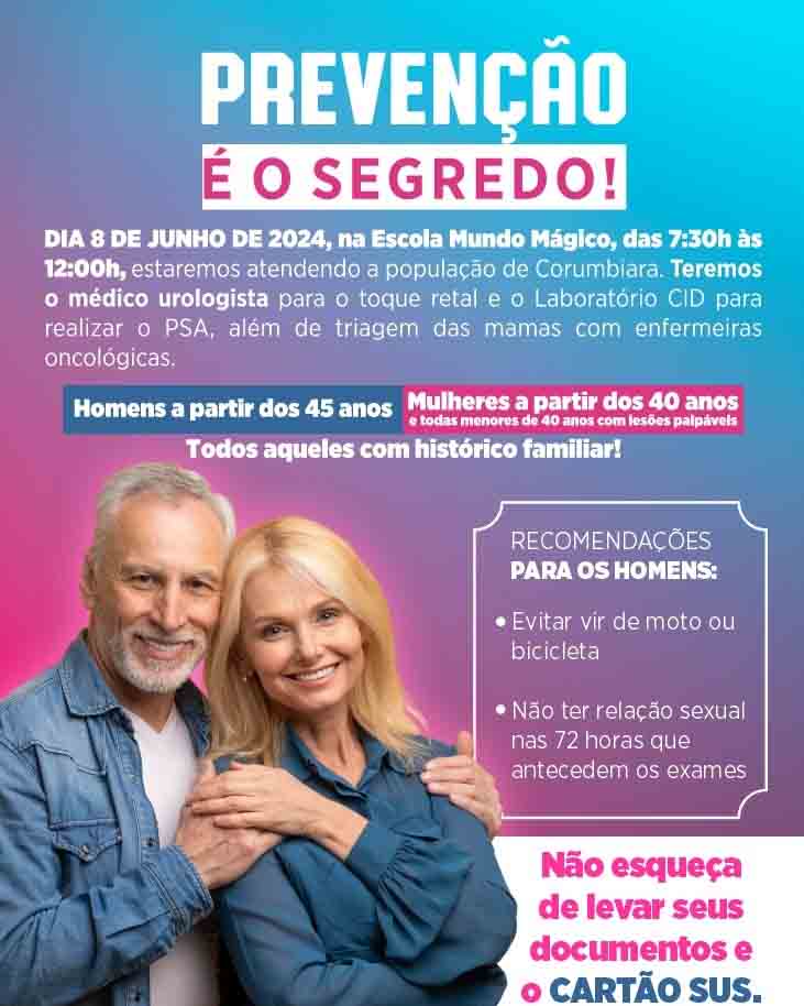Além da triagem das mamas com enfermeiras oncológicas, dois médicos urologistas participam da ação para a realização do exame de toque retal. Além disso, com a parceria do Laboratório CID, serão realizados os exames de PSA. A campanha, em Corumbiara, é voltada às mulheres acima de 40 anos e aos homens com idades a partir dos 45 anos.