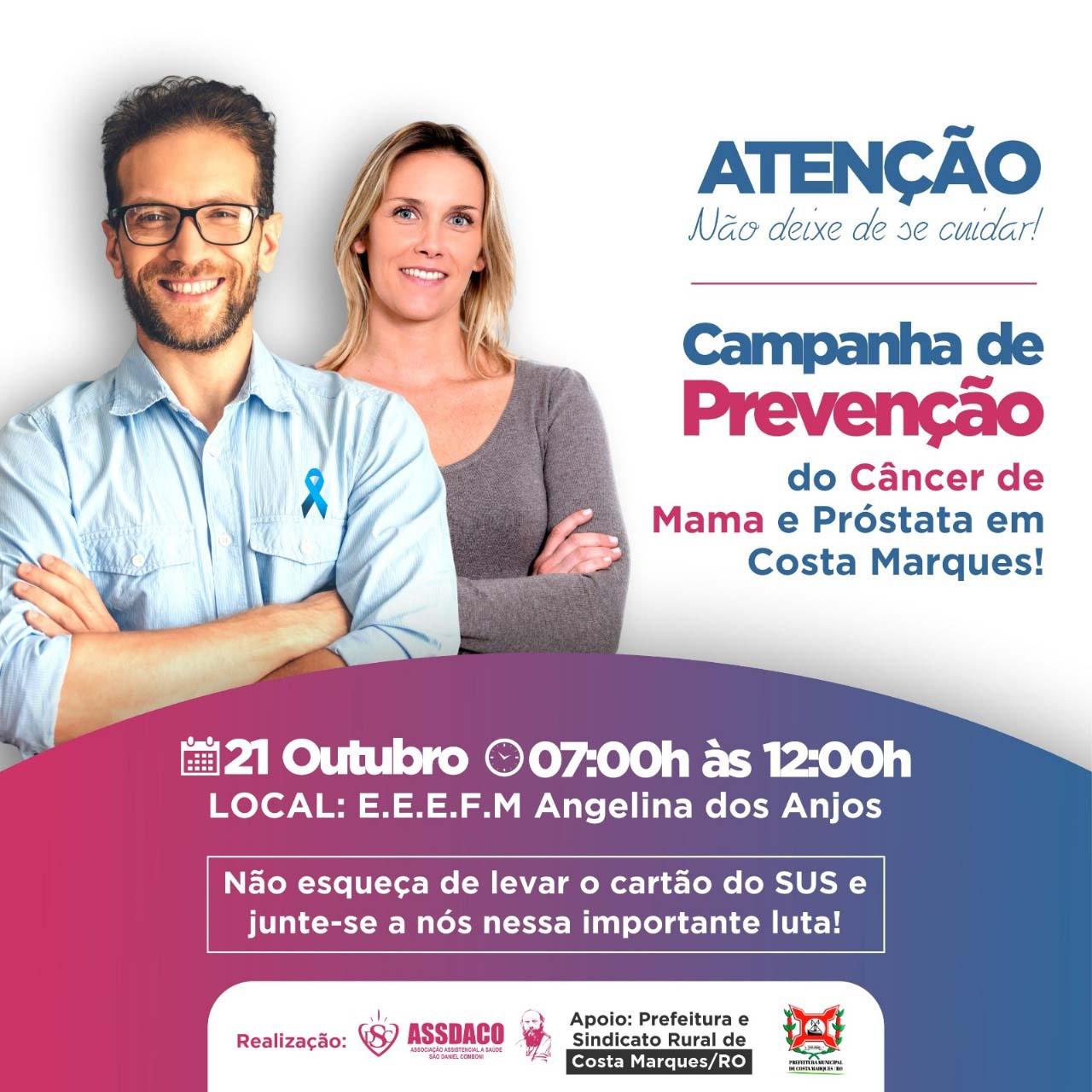 No dia 21 de outubro uma nova campanha de prevenção ao câncer será realizada pela Associação Assistencial à Saúde São Daniel Comboni (ASSDACO), em Costa Marques. Em reunião realizada no município na terça-feira (03), foram definidos todos os detalhes para o sucesso de mais uma edição das campanhas Comboni Rosa e Comboni Azul. Toda a ação acontece na Escola Estadual de Ensino Fundamental e Médio Angelina dos Santos.