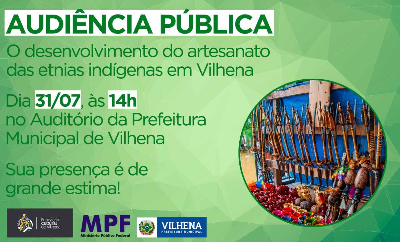 O Ministério Público Federal (MPF) realiza no auditório da Prefeitura de Vilhena, a partir das 14h desta quarta-feira, dia 31, audiência pública para debater os incentivos possíveis ao artesanato indígena na cidade. O evento acontece após reuniões já realizadas entre a Prefeitura e o MPF para estudar formas de valorizar e dar mais visibilidade aos trabalhos das diversas etnias da região que usam Vilhena como pólo de convivência urbana.
