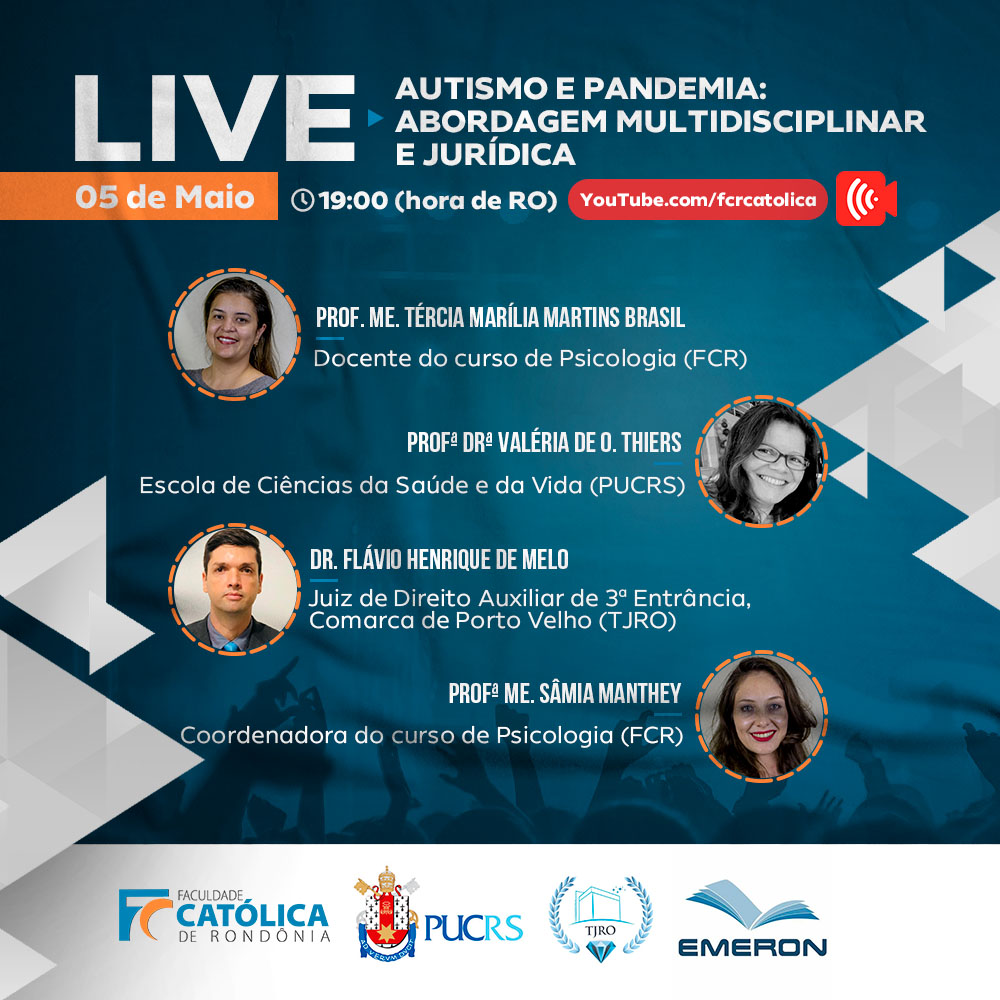 Um assunto que tem cada vez mais ganhado repercussão é o autismo, chamado tecnicamente de Transtorno do Espectro do Autismo (TEA). Para discutir o assunto, a Faculdade Católica de Rondônia (FCR) promove na terça-feira (05), a Live “Autismo e Pandemia: abordagem multidisciplinar e jurídica”. As inscrições estão abertas pelo Even3 e terá a transmissão pelo YouTube.com/fcrcatolica, a partir das 19 horas.