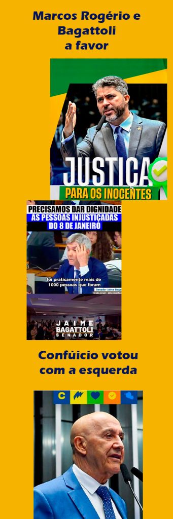 Os outros dois senadores – Marcos Rogério e Jaime Bagattoli – foram ardorosos defensores da anistia ampla geral e irrestrita e, no que foi possível, a Lei da Dosimetria, ambos foram firmes a favor dos injustiçados de 8 de Janeiro. Marcos Rogério fez duros pronunciamentos contra as decisões do STF e principalmente do ministro Alexandre de Moraes.