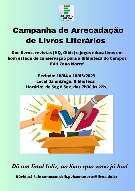 A Biblioteca do Instituto Federal de Educação, Ciência e Tecnologia de Rondônia (IFRO), Campus Porto Velho Zona Norte, iniciou junto à comunidade, no dia 10 de abril, uma Campanha de Arrecadação de Livros Literários e Jogos Educativos. O objetivo desta campanha é arrecadar livros para ampliar o acervo e atender a uma demanda crescente na Biblioteca, a busca por livros de literatura infantil, ficção, poesia, contos, romances, ficção científica, aventura, ação, distopia, gibis, HQs, entre outros. O lema escolhido para a campanha é “Dê um final feliz ao livro que você já leu!”.