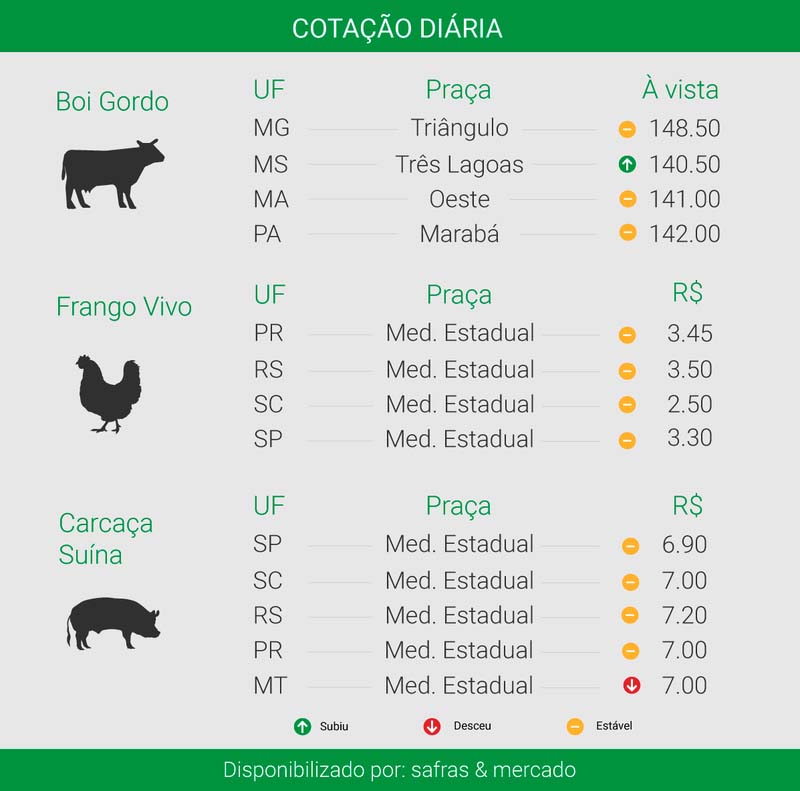 O preço do quilo do frango congelado não sofreu variação e o produto é vendido a R$ 4,59 no estado de São Paulo. O preço do frango resfriado também não sofreu variação e a mercadoria é comercializada a R$ 4,69.