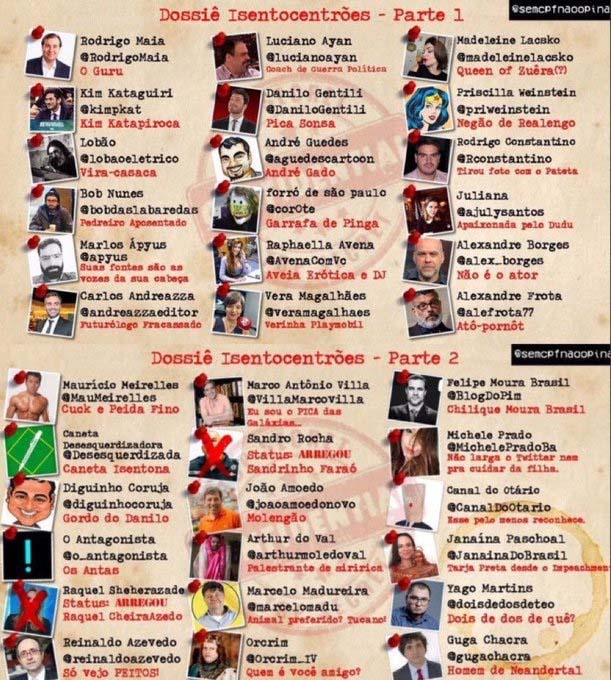 Fazem parte do "dossiê isentocentrões" principalmente jornalistas e políticos, como Kim Kataguiri, Janaina Paschoal, Alexandre Frota, Reinaldo Azevedo e Danilo Gentili