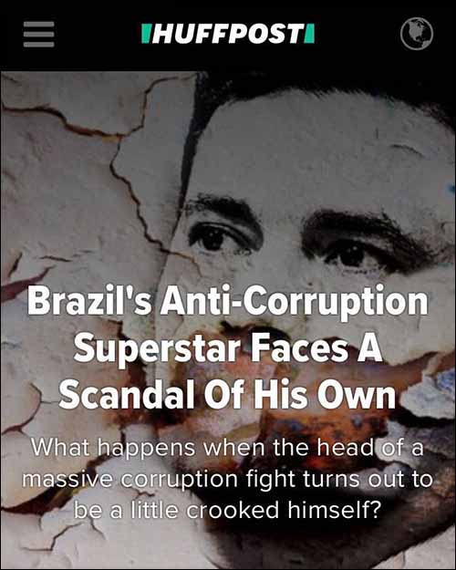 Emblemática ilustração de reportagem do site HuffPost sobre Moro: "Brazil’s Anti-Corruption Superstar Faces A Scandal Of His Own" ("Superstar de combate à corrupção no Brasil enfrenta seu própprio escândalo"). Cresce repúdio a Moro na mídia internacional: