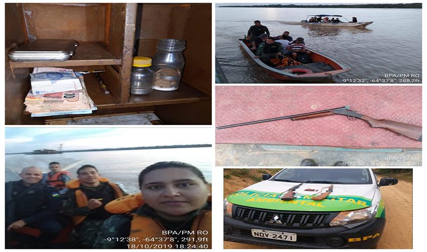 Na tarde de domingo, 20, policiais militares do Batalhão de Polícia Ambiental prenderam Josinaldo Pinheiro de Lima, de 54 anos. Ele foi localizado na Gleba Rio Preto, na linha 2 em Candeias do Jamari. A guarnição chegou até o local em atendimento a uma denúncia de desmatamento irregular em uma área de invasão. Chegando no local um suspeito correu para dentro de um barraco, foi feita a abordagem e durante as buscas foram localizadas, três espingardas, sendo calibres. 20, .38, .44, um revólver calibre. 38, munições, um colete balístico e fogos de artifício que normalmente é utilizado para anunciar a presença dos policiais e/ou da fiscalização Ambiental, ainda foram localizadas duas motosserras, que não estavam com documentação de origem, nem o registro para porte e uso dessas.