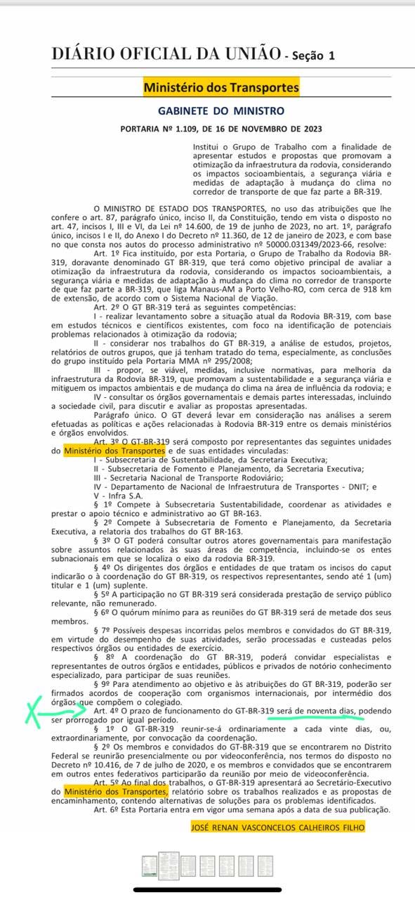 No momento existe um esforço muito grande do ministro dos transportes, Renan Filho, em editar a portaria do GT BR-319. Ao propor medidas, inclusive normativas, para a melhoria da infraestrutura da importante rodovia, ele atende aos Objetivos do Milênio recomendando a sustentabilidade, a segurança viária e a mitigação de impactos ambientais e de mudanças do clima.
