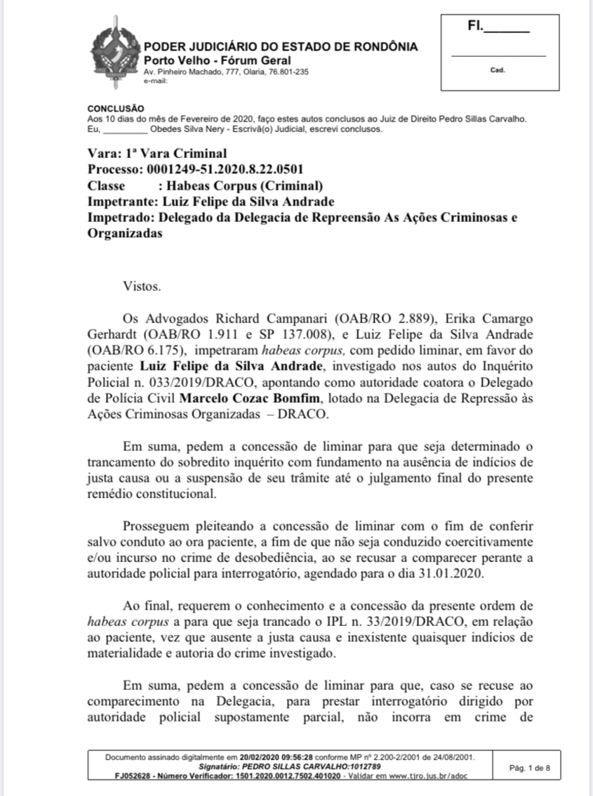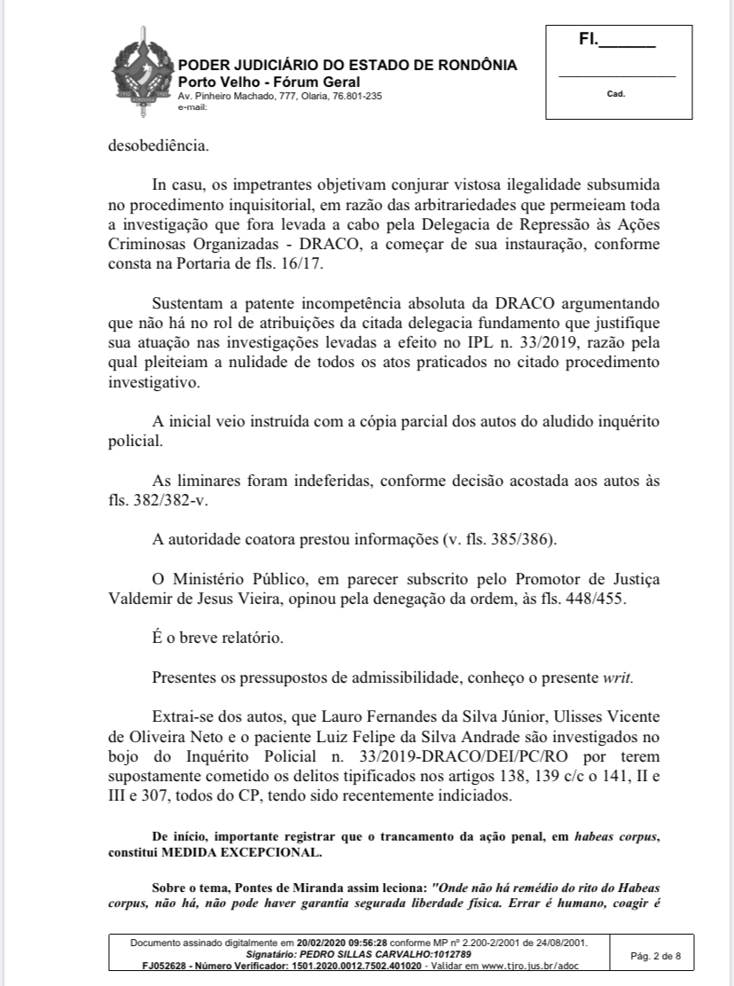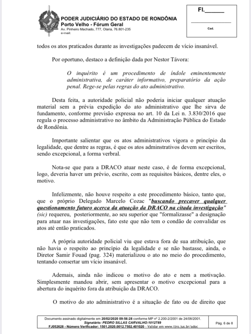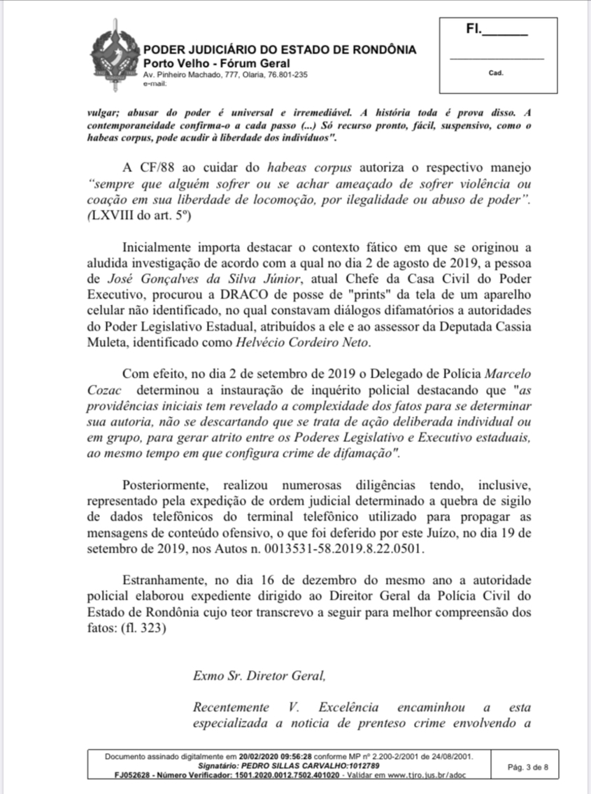 “Com efeito”, prossegue o magistrado, “no dia 2 de setembro de 2019 o Delegado de Polícia Marcelo Cozac determinou a instauração de inquérito policial destacando que ‘as providências iniciais tem revelado a complexidade dos fatos para se determinar sua autoria, não se descartando que se trata de ação deliberada individual ou em grupo, para gerar atrito entre os Poderes Legislativo e Executivo estaduais, ao mesmo tempo em que configura crime de difamação’. Posteriormente, realizou numerosas diligências tendo, inclusive, representado pela expedição de ordem judicial determinado a quebra de sigilo de dados telefônicos do terminal telefônico utilizado para propagar as mensagens de conteúdo ofensivo, o que foi deferido por este Juízo, no dia 19 de setembro de 2019, nos Autos n. 0013531-58.2019.8.22.0501”.