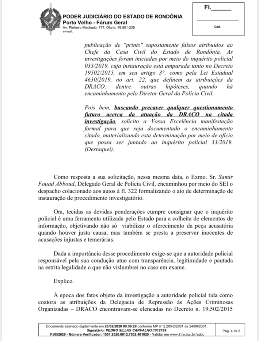 Exmo Sr. Diretor Geral, Recentemente V. Excelência encaminhou a esta especializada a noticia de pretenso crime envolvendo publicação de ‘prints’ supostamente falsos atribuídos ao Chefe da Casa Civil do Estado de Rondônia. As investigações foram iniciadas por meio do inquérito policial 033/2019, cuja instauração está amparada tanto no Decreto 19502/2015, em seu artigo 3°, como pela Lei Estadual 4630/2019, no art. 22, que definem as atribuições da DRACO, dentre outras hipóteses, quando há encaminhamento pelo Diretor Geral da Polícia Civil. Pois bem, buscando precaver qualquer questionamento futuro acerca da atuação da DRACO na citada investigação, solicito a Vossa Excelência manifestação formal para que seja documentado o encaminhamento citado, materializando esta determinação por meio de ofício que possa ser juntado ao inquérito policial 33/2019. (Destaquei)”.