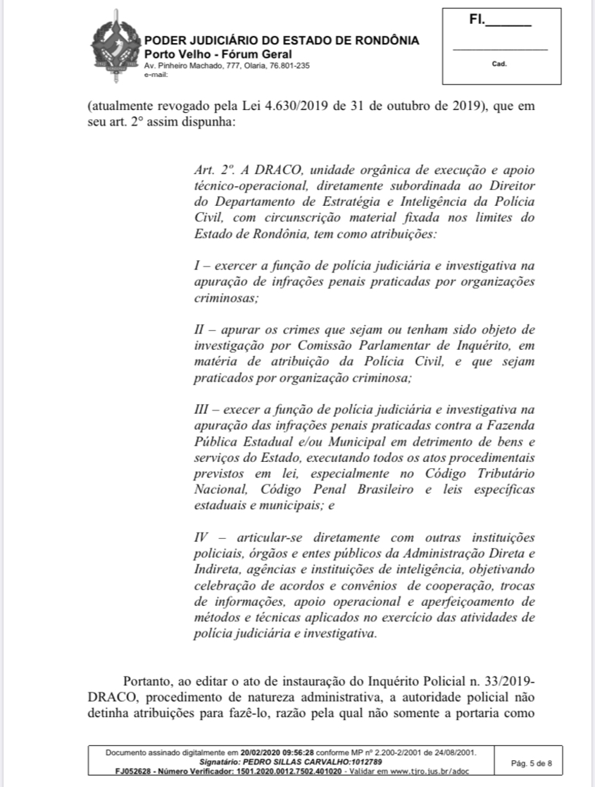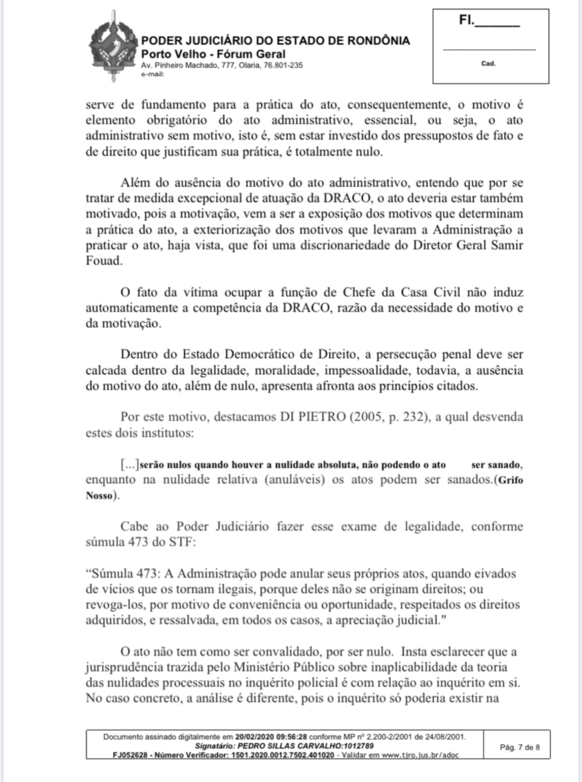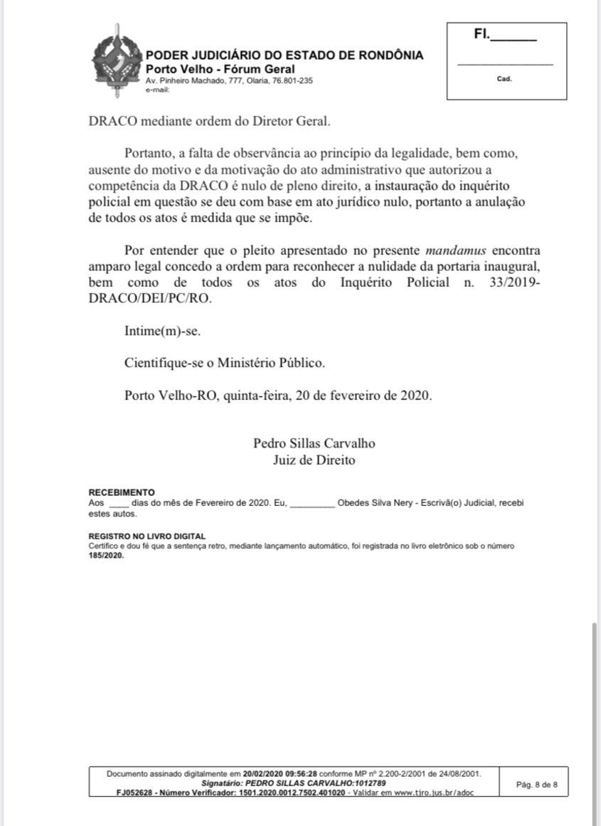 Por último, sentencia: “Portanto, a falta de observância ao princípio da legalidade, bem como, ausente do motivo e da motivação do ato administrativo que autorizou a competência da DRACO é nulo de pleno direito, a instauração do inquérito policial em questão se deu com base em ato jurídico nulo, portanto a anulação de todos os atos é medida que se impõe. Por entender que o pleito apresentado no presente mandamus encontra amparo legal concedo a ordem para reconhecer a nulidade da portaria inaugural, bem como de todos os atos do Inquérito Policial n. 33/2019- DRACO/DEI/PC/RO”.