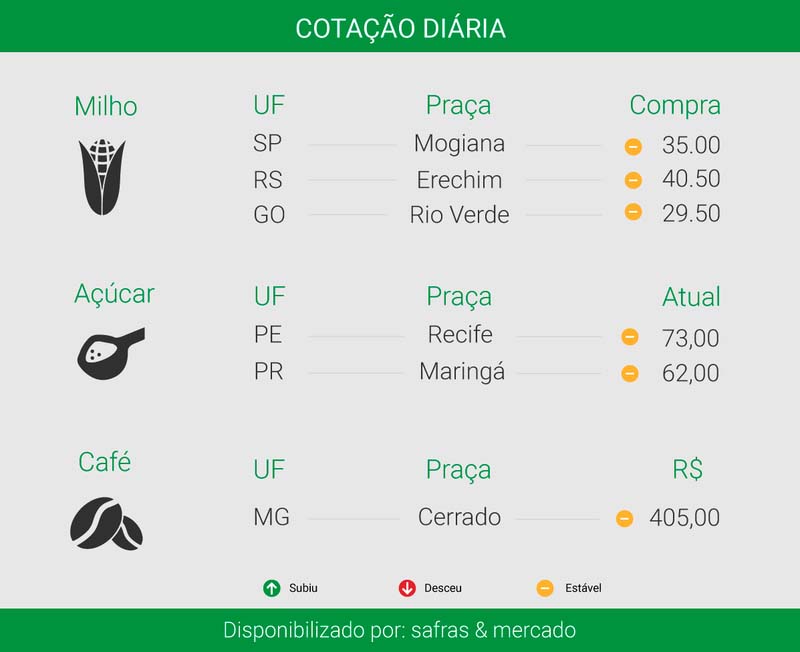No mercado financeiro, o preço da saca de 60 quilos do milho registrou elevação de 0,74% e é negociada a R$ 36,54. Em Campinas, em São Paulo, o produto teve alta de 1,04% no valor e a saca é comercializada a R$ 36,10. Em Cascavel, no Paraná, o preço é R$ 34,50. Em Rondonópolis, no Mato Grosso, o produto é vendido a R$ 28. Em Barreiras, na Bahia, o preço a vista é R$ 31. Os valores são do Canal Rural e Cepea.