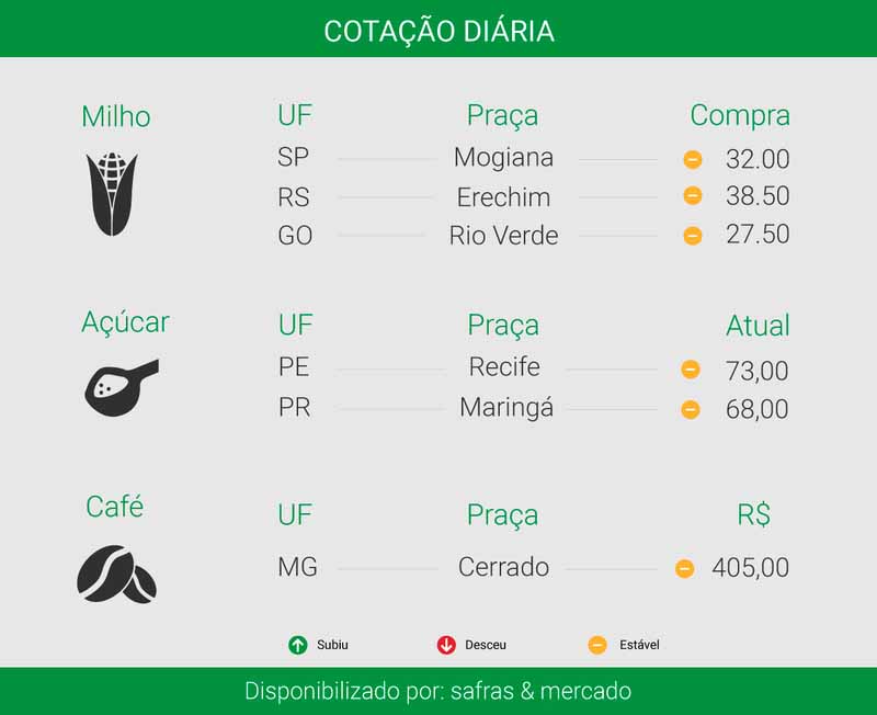 No mercado financeiro, o preço da saca de 60 quilos do milho registrou redução de 0,28% e é negociada a R$ 35,85. Em Campinas, em São Paulo, o produto teve alta de 0,03% no valor e a saca é comercializada a R$ 35,39. Em Cascavel, no Paraná, o preço é R$ 33. Em Rondonópolis, no Mato Grosso, o produto é vendido a R$ 28. Em Barreiras, na Bahia, o preço a vista é R$ 31,25. Os valores são do Canal Rural e Cepea.