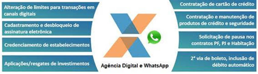 A CAIXA orienta seus clientes a acessarem os serviços do banco por meio dos canais digitais e de telesserviço. Além de acesso à movimentação bancária através da internet e celular, a CAIXA reforçou o atendimento em canais remotos, como a Agência Digital, Telesserviço e WhatsApp.