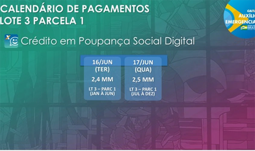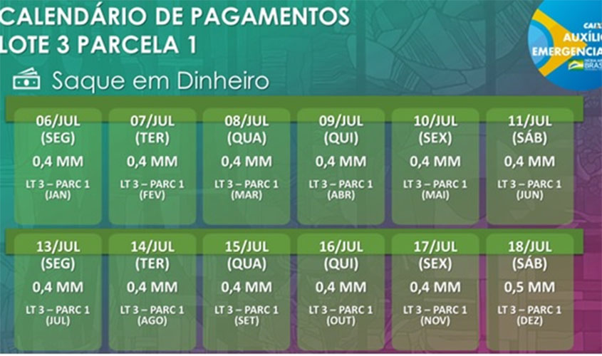 As datas, que seguem portaria a ser publicada e preveem o recebimento dos recursos por parte do Ministério da Cidadania, têm o objetivo de aprimorar o pagamento e evitar concentrações nos meios digitas e aglomerações nos pontos de atendimento. Nesta etapa de pagamentos da primeira parcela do Auxílio Emergencial, os beneficiários nascidos de janeiro a junho poderão movimentar digitalmente os valores pelo CAIXA Tem a partir da terça-feira (16) e os nascidos de julho a dezembro, a partir da quarta-feira (17).