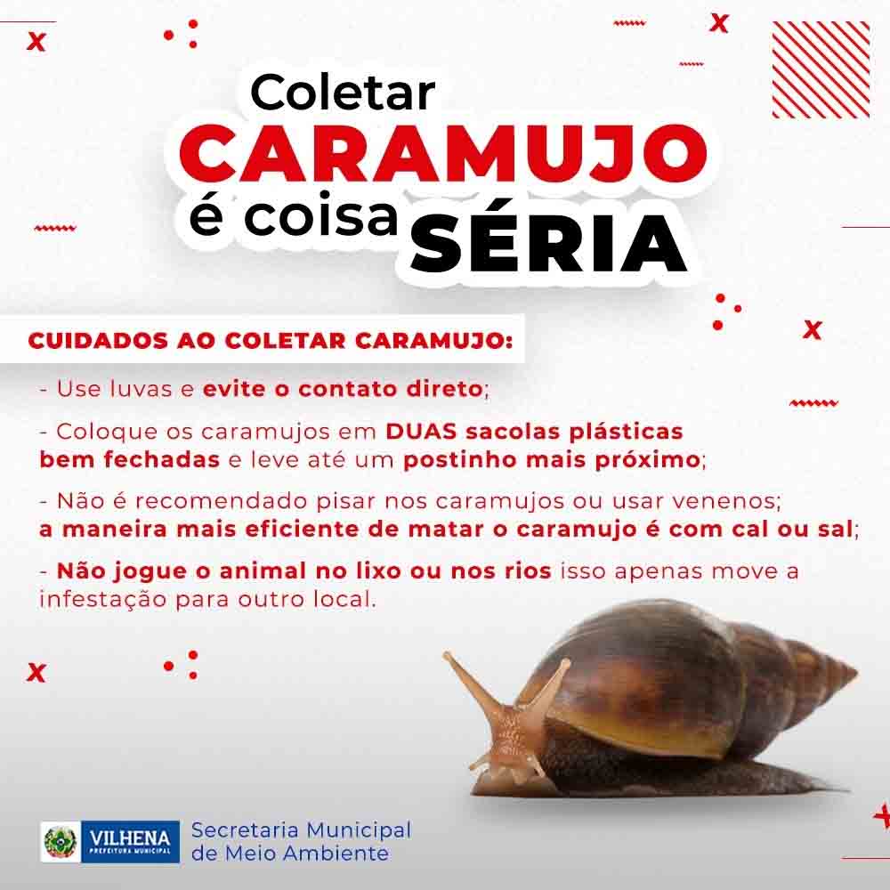 A Secretaria Municipal de Saúde (Semus) em parceria com a Secretaria de Meio Ambiente (Semma) intensifica as ações neste período chuvoso para conter a proliferação de caramujos na cidade. Desta vez, em colaboração com a comunidade, a Prefeitura orienta os moradores a coletarem os caramujos e levarem até o posto de saúde mais próximo para que a Prefeitura realize a incineração.
