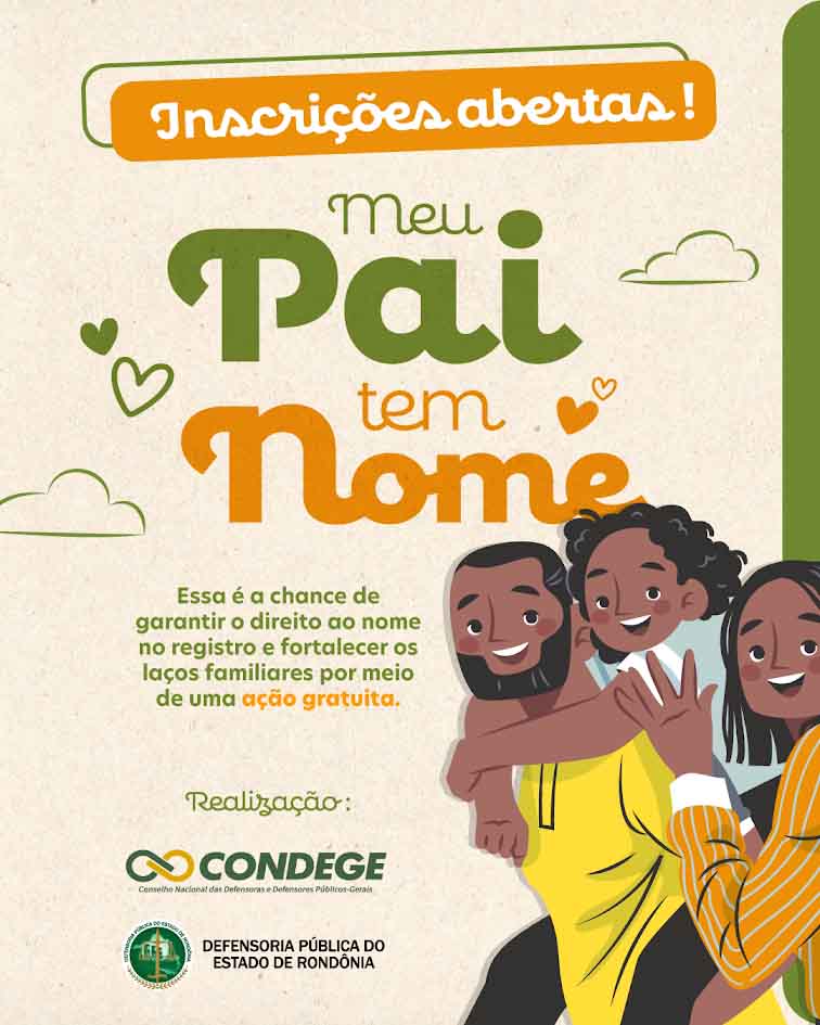 A Defensoria Pública do Estado de Rondônia (DPE-RO) realiza, no próximo dia 16 de agosto, mais uma edição da campanha nacional “Meu Pai Tem Nome”, uma iniciativa que busca garantir o direito fundamental ao reconhecimento de paternidade e fortalecer os vínculos familiares. A ação acontece simultaneamente em todo o país, com o apoio do Colégio Nacional dos Defensores Públicos-Gerais (CONDEGE), e integra o calendário nacional da Defensoria Pública.