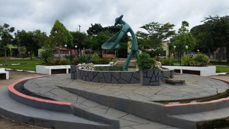 No monumento na praça, garimpeiro segura a bateia, muito comum ali, 30 anos atrásCampo Novo de Rondônia cresceu a partir da garimpagem da cassiterita (minério de estanho). Situa-se na região de Ariquemes.