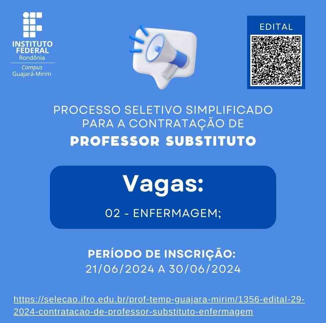 Para mais informações, o Edital 30/2024/GJM-CGAB/IFRO completo pode ser acessado neste link: https://selecao.ifro.edu.br/prof-temp-guajara-mirim/1356-edital-29-2024-contratacao-de-professor-substituto-enfermagem