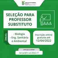 Estão abertas as inscrições para o Processo Seletivo Simplificado para a contratação de professores substitutos para o Instituto Federal de Educação, Ciência e Tecnologia de Rondônia (IFRO), Campus Colorado do Oeste. Há uma vaga para cada área, que são Biologia e Engenharia Sanitária e Ambiental.