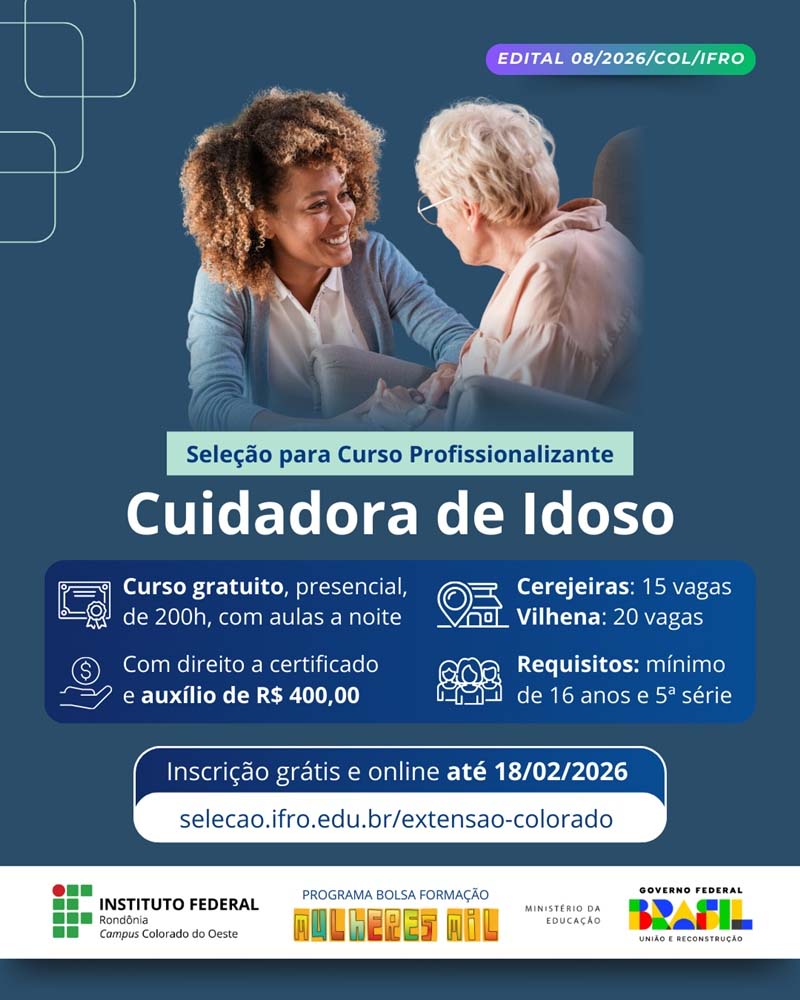 Está aberta a seleção de alunas para o curso de Cuidadora de Idoso a ser realizado em Cerejeiras e em Vilhena pelo Instituto Federal de Rondônia (IFRO), Campus Colorado do Oeste. O curso é presencial e gratuito e ao final as estudantes com a frequência mínima recebem o certificado e um auxílio financeiro no valor de R$ 400,00. A iniciativa faz parte do Programa Mulheres Mil, do Governo Federal.