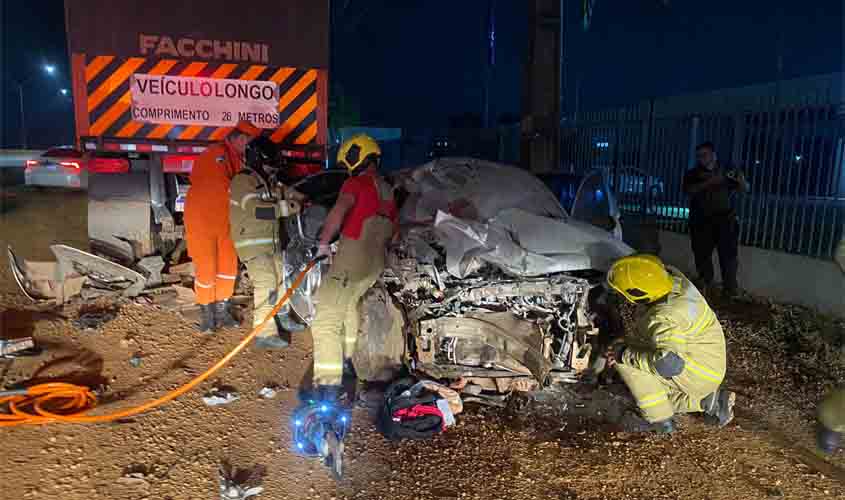 Porto Velho, Rondônia - A Polícia Rodoviária Federal (PRF) registrou um grave acidente de trânsito no final da noite de quarta-feira (24), onde um carro modelo Ônix saiu da BR-364 e colidiu violentamente com a traseira de uma carreta estacionada em frente a uma empresa. O impacto deixou o motorista e duas passageiras em estado grave, presos nas ferragens do veículo, que começou a pegar fogo.
