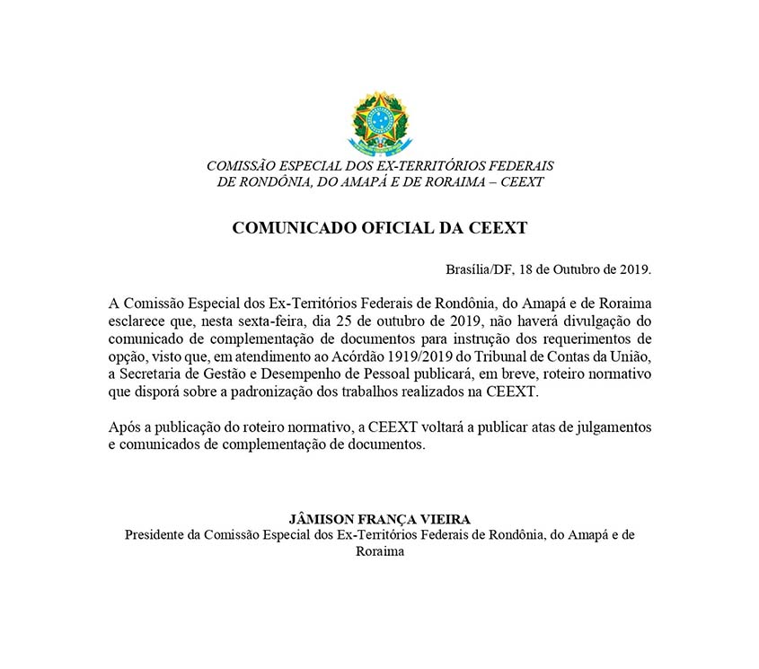A Comissão Especial dos Ex-Territórios de Rondônia, Amapá e Roraima (CEEXT), divulgou um comunicado nesta sexta-feira (25/10), informando que em atendimento ao Acórdão 1919/2019 do Tribunal de Contas da União, a Secretaria de Gestão e Desempenho de Pessoal publicará, no prazo de até 60 dias, um roteiro normativo ou norma interna, documento de padronização dos trabalhos realizados pela Comissão.