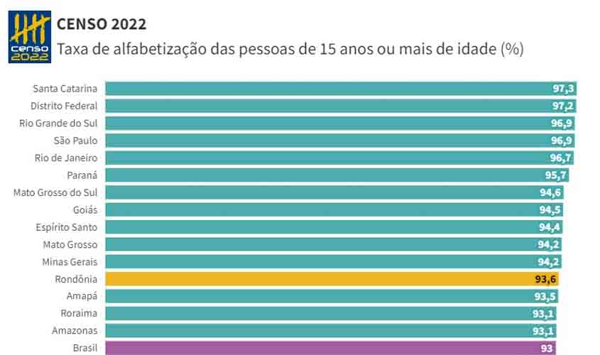 Dados do Censo Demográfico 2022 mostram que a taxa de alfabetização no estado de Rondônia é de 93,6%, sendo a maior da Região Norte, pouco à frente do estado do Amapá, que tem 93,5% de sua população alfabetizada. A taxa brasileira é de 93%.